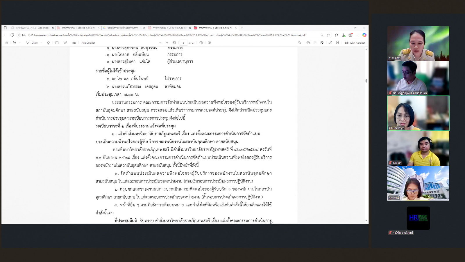 โดยมีวาระสำคัญที่ร่วมกันพิจารณา ได้แก่ การพิจารณาผลการประเมินความพึงพอใจของผู้รับบริการ ของพนักงานในสถาบันอุดมศึกษา สายสนับสนุน รอบการประเมินที่ 2 ปีงบประมาณ พ.ศ. 2568 ระหว่างวันที่ 1 เมษายน พ.ศ. 2568 - 30 กันยายน พ.ศ. 2568