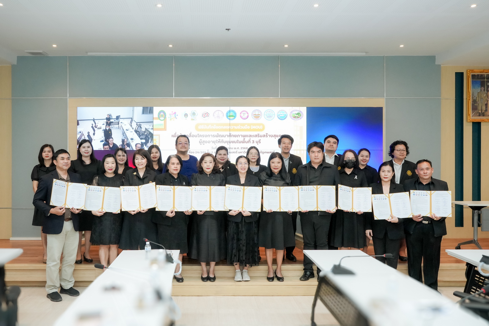 เมื่อวันที่ 24 ธันวาคม พ.ศ. 2568 ณ ห้องประชุม 24/204 ชั้น 2 อาคารรัตนเทพสตรี ผศ.ศศิวิมล สุทธิสาร รองอธิการบดีฝ่ายกิจการนักศึกษาและบริการวิชาการ มหาวิทยาลัยราชภัฏเทพสตรี พร้อมด้วย ผศ.ดร.มยุรี รัตนเสริมพงศ์ คณบดีคณะมนุษยศาสตร์และสังคมศาสตร์, อ.ดร.ศตพล มุ่งค้ำกลาง คณบดีคณะวิทยาศาสตร์และเทคโนโลยี, รศ.ดร.รัชดาภรณ์ อมรชีวิน คณบดีคณะเทคโนโลยีสารสนเทศ, ผู้บริหารคณะมนุษยศาสตร์และสังคมศาสตร์ และคณาจารย์ เป็นผู้แทนมหาวิทยาลัยราชภัฏเทพสตรี ร่วมพิธีลงนามบันทึกข้อตกลงความร่วมมือเพื่อขับเคลื่อนโครงการพัฒนาศักยภาพและเสริมสร้างสุขภาวะผู้สูงอายุให้กับชุมชนในพื้นที่ 3 บุรี ระหว่าง มหาวิทยาลัยราชภัฏเทพสตรี กับ หน่วยงานภาคีเครือข่าย ซึ่งประกอบด้วย สำนักงานพัฒนาสังคมและความมั่นคงของมนุษย์จังหวัดลพบุรี, สำนักงานพัฒนาสังคมและความมั่นคงของมนุษย์จังหวัดสิงห์บุรี, สำนักงานพัฒนาสังคมและความมั่นคงของมนุษย์จังหวัดสระบุรี, เทศบาลตำบลเขาพระยาเดินธง และโรงพยาบาลส่งเสริมสุขภาพตำบลเขาสมอคอน จ.ลพบุรี, เทศบาลตำบลหนองแค และองค์การบริหารส่วนตำบลท่าคล้อ จ.สระบุรี, องค์การบริหารส่วนตำบลโพสังโฆ และองค์การบริหารส่วนตำบลบ้านแป้ง จ.สิงห์บุรี โดยมีสาระสำคัญตามบันทึกลงนามเพื่อพัฒนาศักยภาพผู้สูงอายุให้ได้รับการเสริมสร้างและดูแลสุขภาวะแบบมีส่วนร่วมโดยเครือข่ายชุมชน ตลอดจนเพื่อสร้างชุมชนรอบรู้ด้านสุขภาวะ (Well-being) แบบบูรณาการทั้งทางกาย ทางจิต ทางสังคม ทางจิตวิญญาณ และทางสติปัญญา และเพื่อสนับสนุนองค์ความรู้และร่วมขับเคลื่อนการพัฒนาชุมชนที่เป็นมิตรกับผู้สูงอายุ (Age-friendly Communities) ตามบริบทของพื้นที่ โดยบันทึกลงนามความร่วมมือฉบับดังกล่าวจะสิ้นสุดสัญญาการลงนามความร่วมมือต่อเมื่อฝ่ายหนึ่งฝ่ายใดขอยกเลิกสัญญา หรือจนกว่าโครงการจะแล้วเสร็จ
