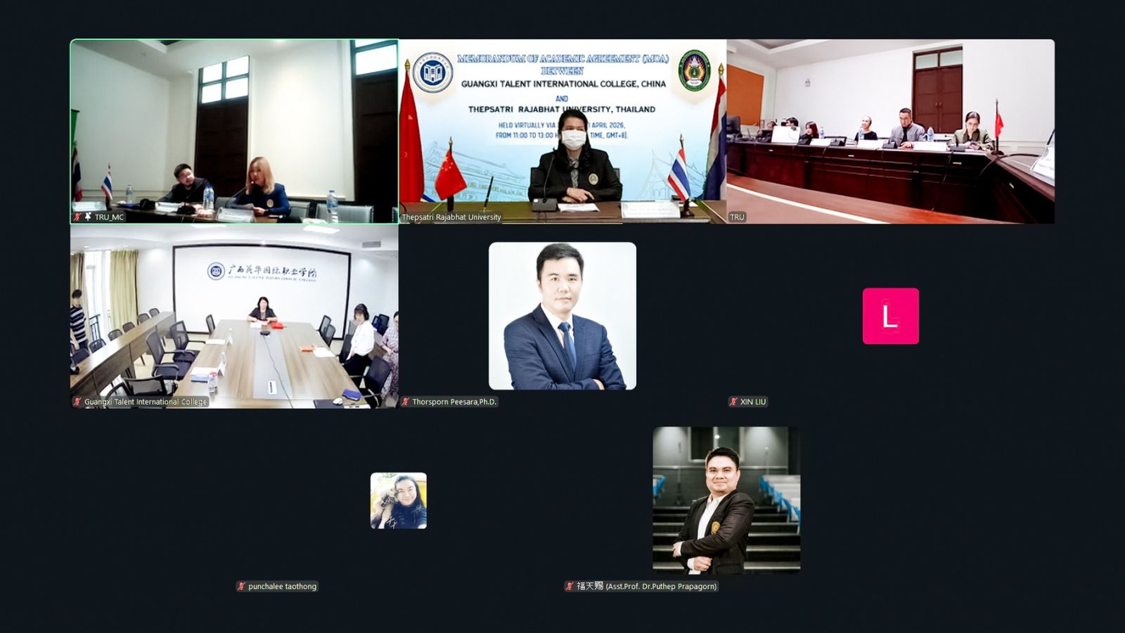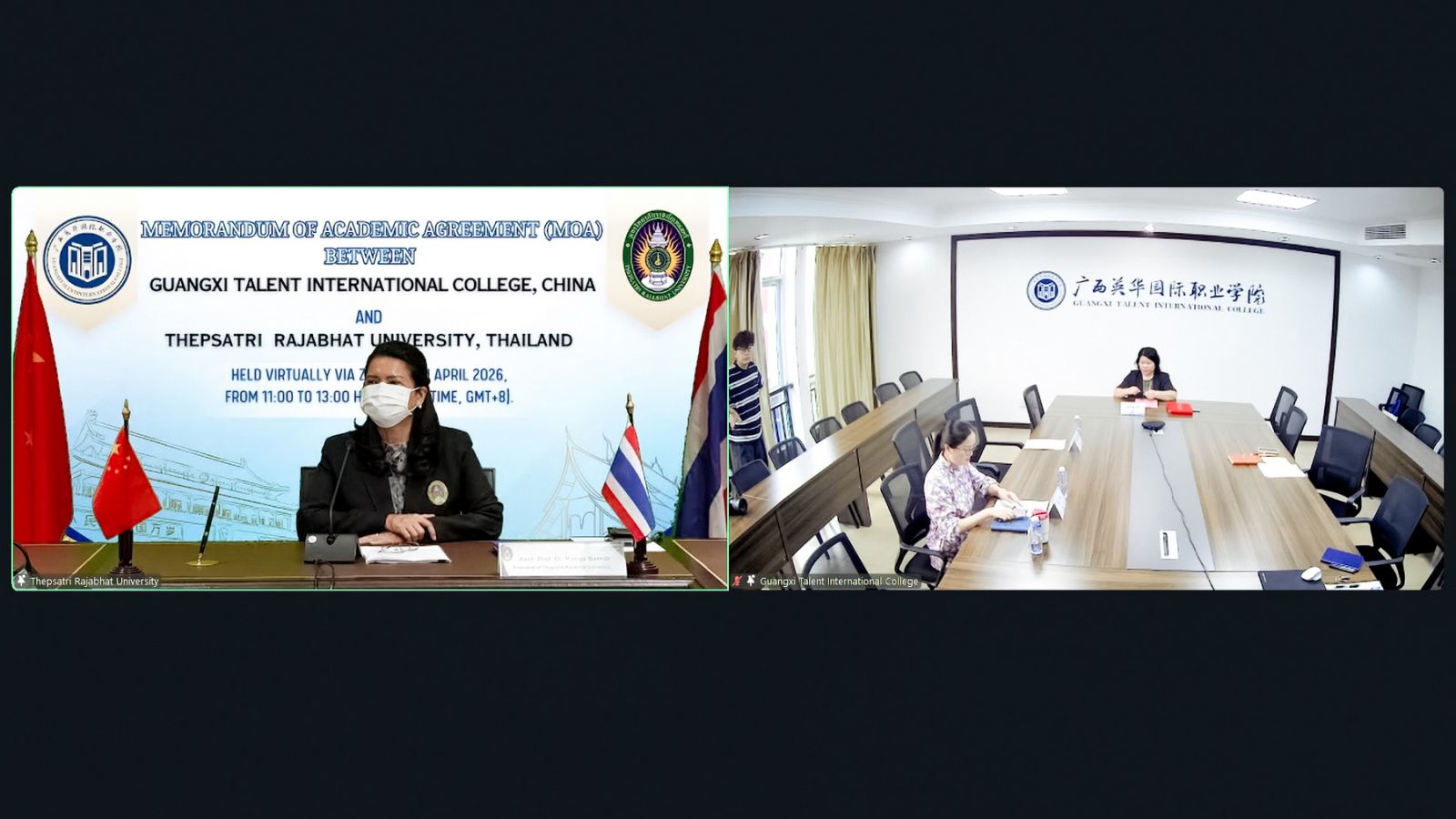 เมื่อวันที่ 21 เมษายน พ.ศ. 2569 ณ ห้องประชุมโกษาปาน ชั้น 2 อาคารลวะศรี ผศ.ดร.กันยา บาร์นท์ อธิการบดีมหาวิทยาลัยราชภัฏเทพสตรี พร้อมด้วย คณะผู้บริหาร และบุคลากร เป็นผู้แทนมหาวิทยาลัยราชภัฏเทพสตรี ร่วมพิธีลงนามบันทึกข้อตกลงความร่วมมือทางวิชาการ (MOA) ระหว่าง มหาวิทยาลัยราชภัฏเทพสตรี กับ Guangxi Talent International College สาธารณรัฐประชาชนจีน ในรูปแบบการลงนามระบบ ระบบ Zoom Meeting โดยมีสาระสำคัญตามบันทึกลงนามเพื่อส่งเสริมความร่วมมือด้านการศึกษา การวิจัย และการพัฒนานักศึกษาในระดับนานาชาติ