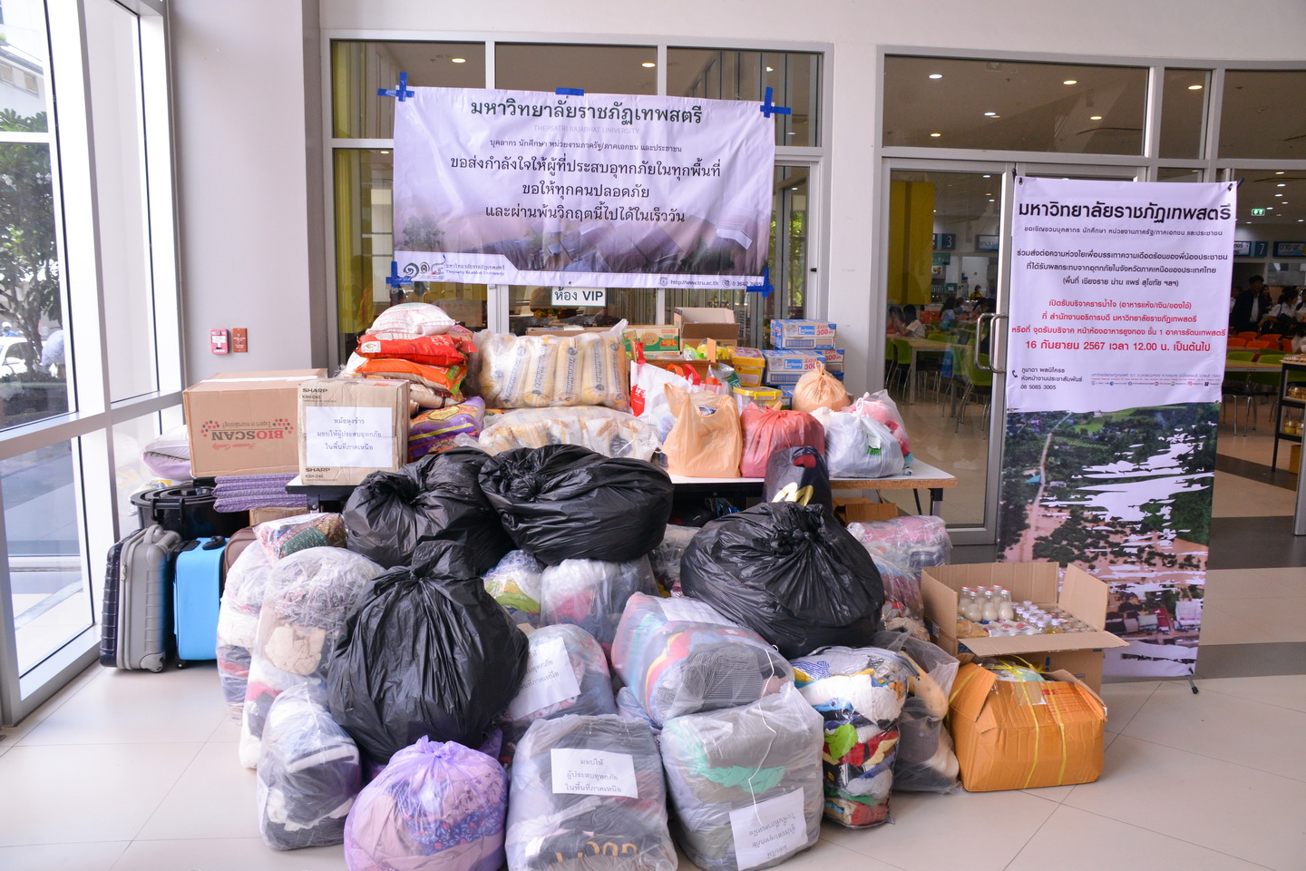 ระหว่างวันที่ 16 - 20 กันยายน พ ศ. 2567 ณ บริเวณห้องโถง ชั้น 1 อาคารรัตนเทพสตรี มหาวิทยาลัยราชภัฏเทพสตรี โดย ผศ.ดร.กันยา บาร์นท์ อธิการบดีมหาวิทยาลัยราชภัฏเทพสตรี เปิดศูนย์รวมน้ำใจพี่น้องประชาชนชาวไทยเพื่อช่วยเหลือผู้ประสบอุทกภัยในเขตภาคเหนือ โดยผู้มีจิตอันเป็นกุศลสามารถบริจาคเงิน เครื่องอุปโภคบริโภค และน้ำดื่ม ได้ที่ห้องโถง ชั้น 1 อาคารรัตนเทพสตรี โดยเงินและสิ่งของที่ได้รับบริจาคมหาวิทยาลัยราชภัฏเทพสตรี จะส่งต่อไปยังศูนย์ช่วยเหลือผู้ประสบภัยในเขตภาคเหนือที่มหาวิทยาลัยราชภัฏเชียงรายเพื่อช่วยเหลือผู้ประสบอุทกภัยต่อไป